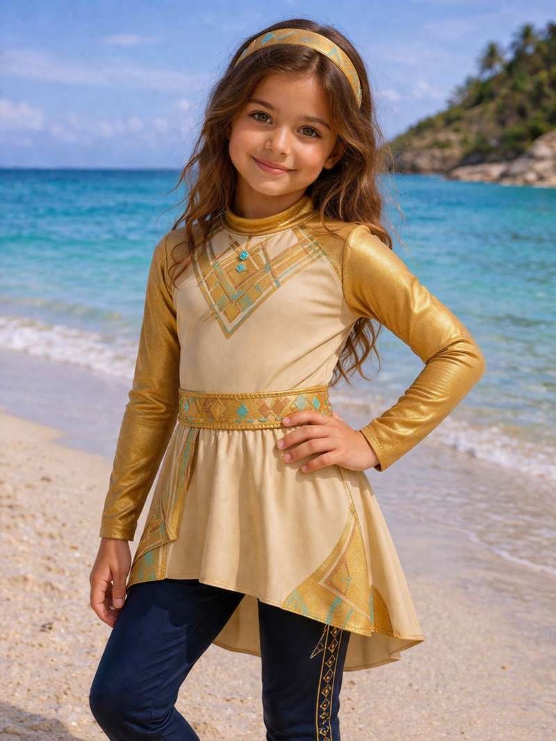 This short-sleeve design offers maximum freedom for active kids combining a lightweight structure with soft flowing layers inspired by desert sands. The geometric chest detailing reflects pyramid symmetry while subtle turquoise accents echo the vibrancy of the Nile