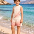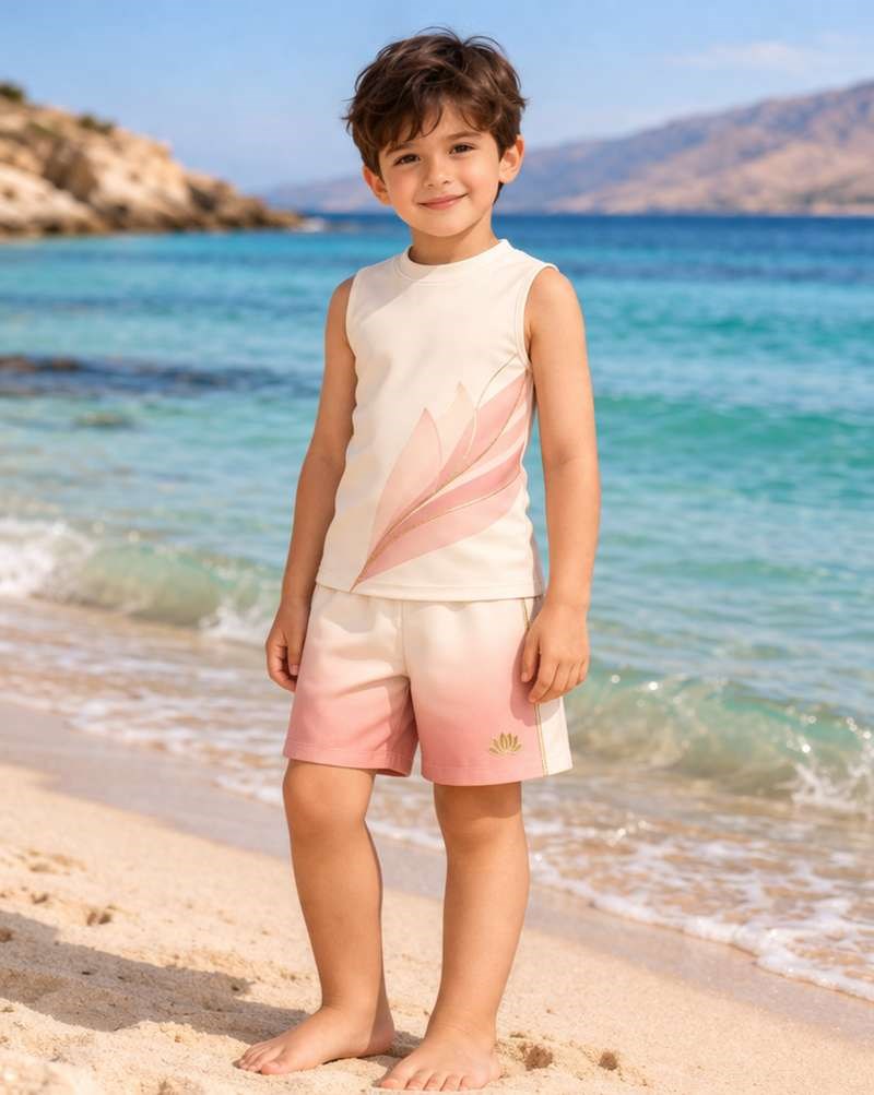 This refined swim set features a clean sleeveless silhouette paired with comfortable shorts highlighted by a subtle lotus inspired detail that flows gently across the design. The soft blend of ivory and blush tones creates a light elegant look while maintaining a playful and fresh summer feel