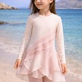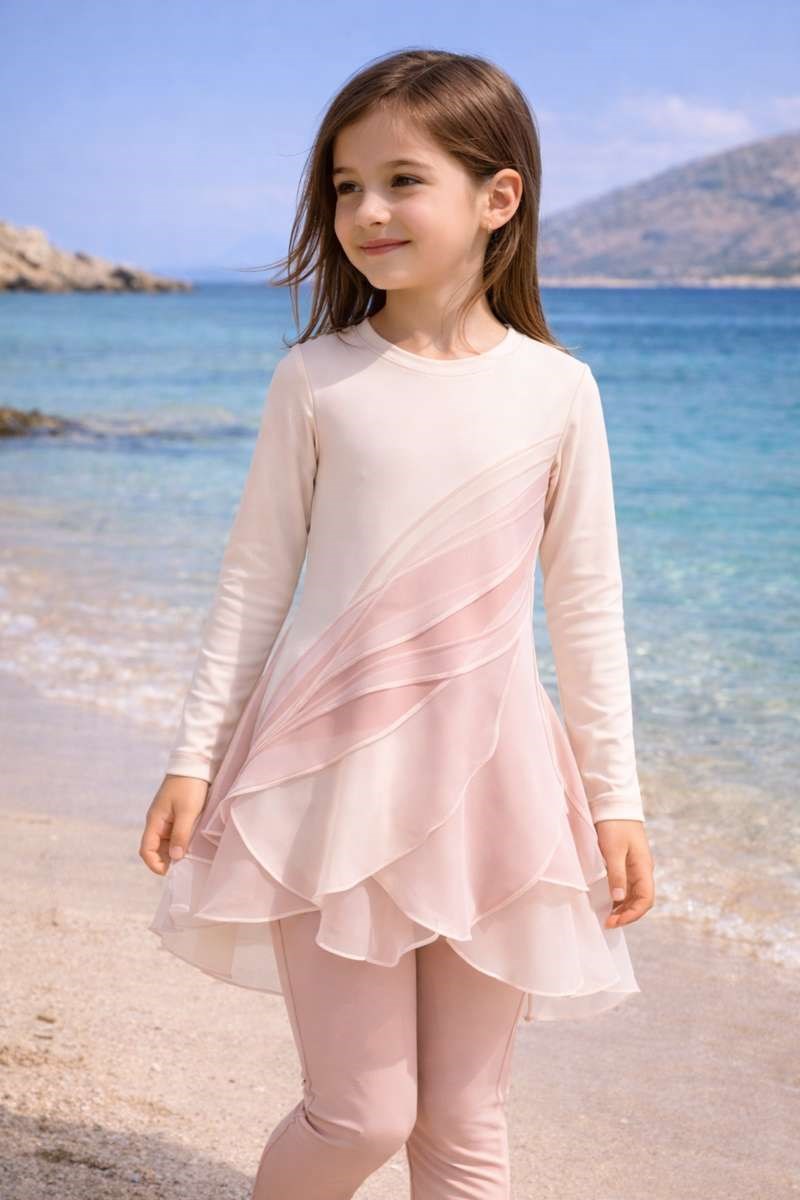 This modest swim set features a long sleeve tunic with delicate layered panels that flow like lotus petals creating a graceful and lightweight silhouette. The soft gradient of blush and ivory tones adds a dreamy feminine touch while maintaining a clean and balanced design