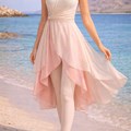 This elegant modest design features a clean structured upper silhouette paired with flowing layered panels shaped like delicate lotus petals. The soft gradient transitions between ivory and blush tones create a dreamy luminous effect while the lightweight chiffon layers move effortlessly with every step
