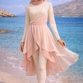 Designed specifically for hijab wearers this set features a long sleeve silhouette paired with a soft flowing layered tunic that mimics the delicate structure of lotus petals. The seamless gradient of blush and ivory tones enhances the natural fluidity of the design while the lightweight chiffon layers move effortlessly with every step