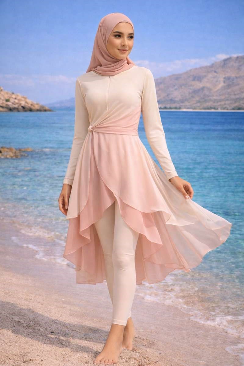 The look is completed with a matching swim hijab that blends harmoniously with the design, creating a refined and cohesive aesthetic