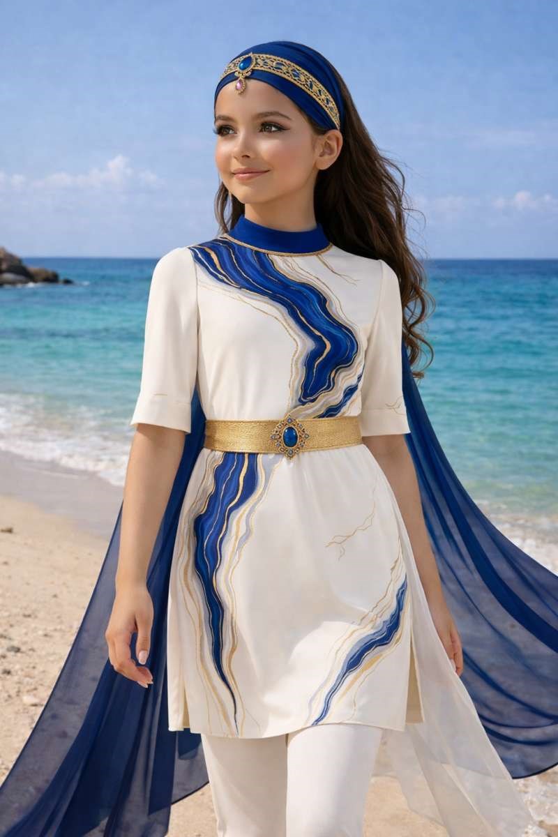 Inspired by the timeless beauty of Queen Nefertiti, this piece features a refined ivory base enriched with soft flowing marble lines in deep lapis blue, delicately outlined with light gold accents. The silhouette is gently structured yet comfortable, allowing freedom of movement while maintaining a polished and elegant look